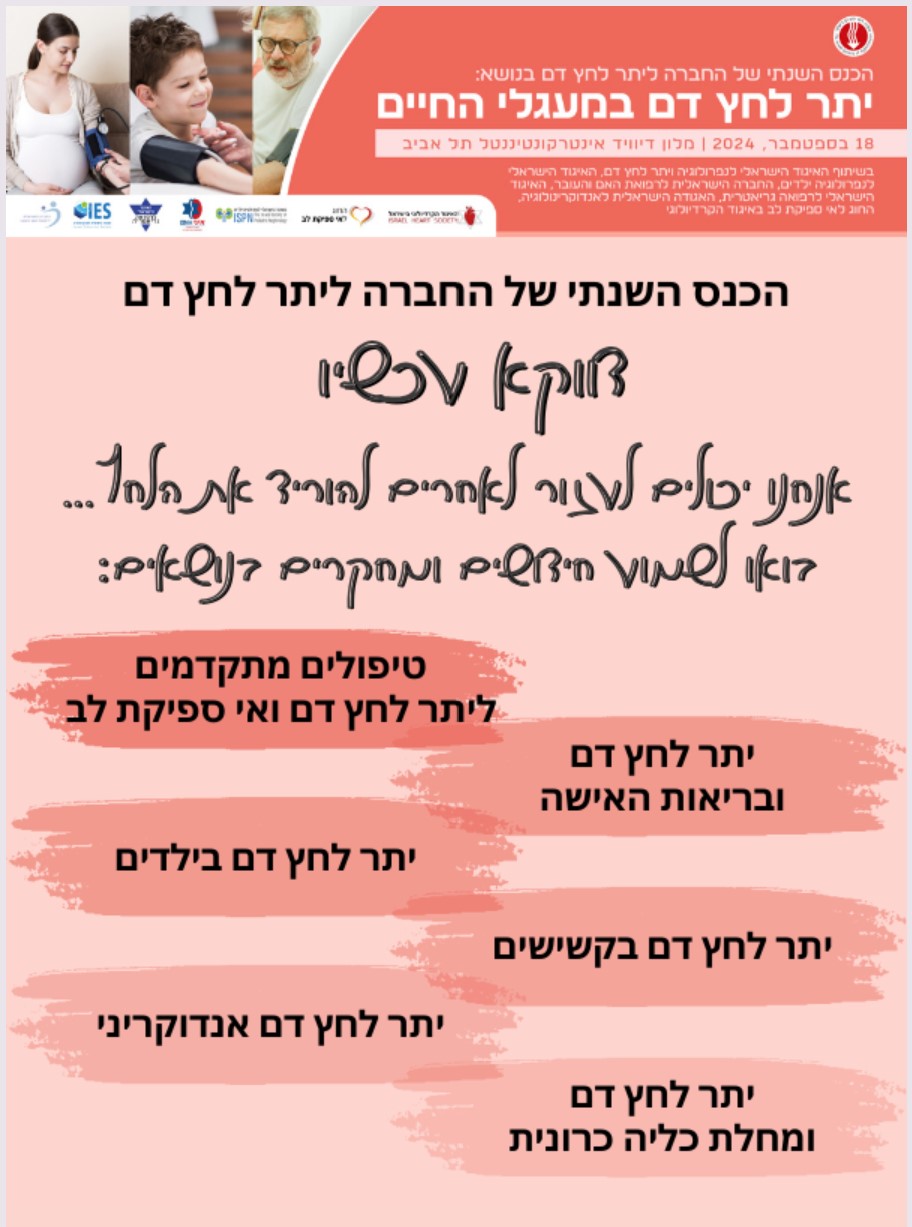 פורסמה התכנית המלאה של הכנס “יתר לחץ דם במעגלי החיים”, הכנס השנתי של החברה ליתר לחץ דם בשיתוף האגודה לאנדוקרינולוגיה ואיגודים רפואיים נוספים! הרשמו כעת לכנס, שיתקיים ב-18/09/24, במלון דיוויד אינטרקונטיננטל בתל אביב.