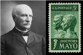 William Worall Mayo (1819-1911) was born in Eccles, England, and studied medicine in Manchester, Glasgow, and London before leaving for the U.S. in 1845. His first work in his new country was as a pharmacist at Bellevue Hospital in New York. He moved to Rochester, Minnesota in 1863 as part of his appointment as surgeon for the military during the Civil War. Both of Mayo’s sons, William (Will) James Mayo (1861-1939) and Charles (Charlie) Horace Mayo (1865-1939) grew up in Rochester, and when old enough both attended medical school. William graduated in 1883 and joined his father’s practice, with Charles joining after he completed his training in 1888. It was in 1910 when WW Mayo interested in the extraction and distillation of alcohol from animal and vegetable wastes suffered a serious injury when the extraction mechanism crushed his arm and hand. That injury necessitated an amputation. Complications resulted in his death in March 1911, shortly before his 92nd birthday. Charlie Mayo retired in 1930 and died of pneumonia in 1939 in Chicago. His two sons Charles William Mayo and Joseph Graham Mayo both worked at the clinic. A grandson, Charles Horace Mayo II, served also a residency at the clinic.