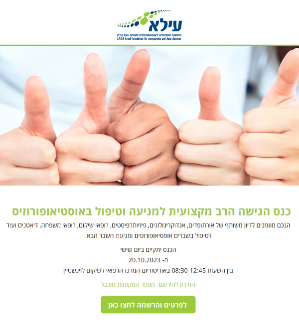 ראשי » משולחן האגודה » הזמנה להירשם ל**כנס הגישה הרב מקצועית למניעה וטיפול באוסטיאופורוזיס**ב- 20.10.2023 באודיטוריום המרכז הרפואי לשיקום לוינשטיין הזמנה להירשם ל**כנס הגישה הרב מקצועית למניעה וטיפול באוסטיאופורוזיס**ב- 20.10.2023 באודיטוריום המרכז הרפואי לשיקום לוינשטיין תאריך: 20/10/2023 לפרטים והרשמה לחצו כאן